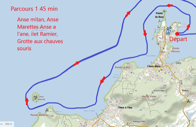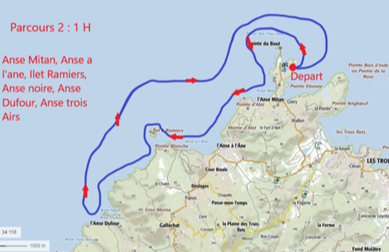 Excursion de 45 minutes : les Trois Ilets (îlots Thébloux, Charles et Sixtain), l’Anse Mitan, l’Anse Marette, l’Anse à l’Ane, Ilet Ramier et la « Grotte aux Chauve-Souris » aux Anses-d’Arlet.