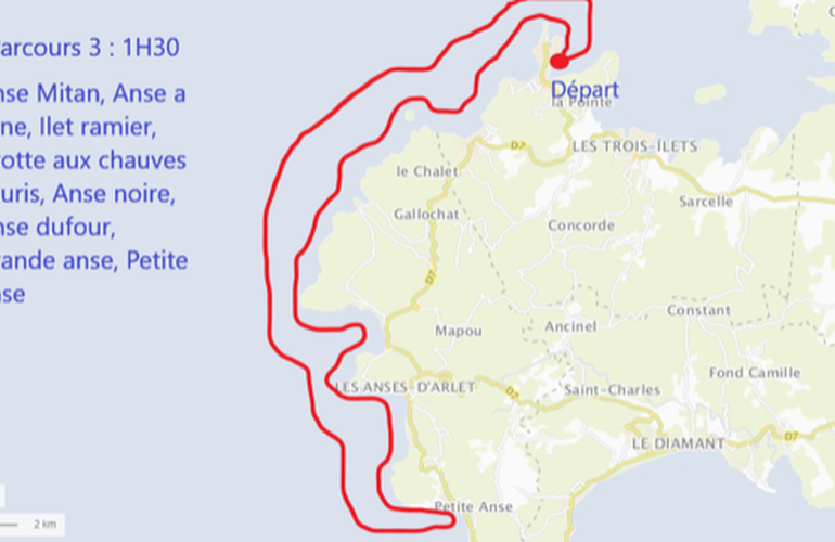 En fonction de la durée, voici les parcours établis (comme vous pouvez le voir, il s’agit de véritables excursions, permettant de découvrir les plus belles côtes de la Martinique) :