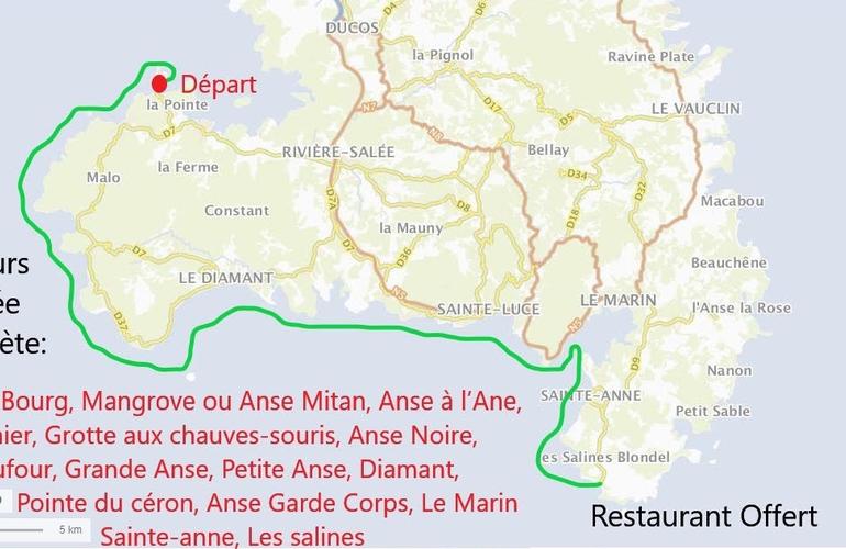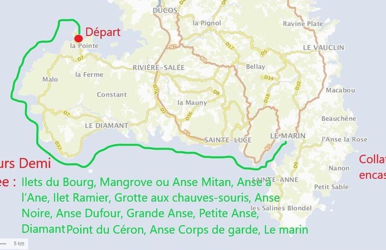 Excursion d’une demi-journée : l’Ilet du Bourg, la célèbre Mangrove, l’Anse Mitan, l’Anse à l’Ane, l’Ilet Ramier, la « Grotte aux Chauves-Souris », l’Anse Noire, l’Anse Dufour, la Grande Anse, la Petite Anse, le Rocher du Diamant, l’Anse Céron, St Luce et enfin Le Marin.