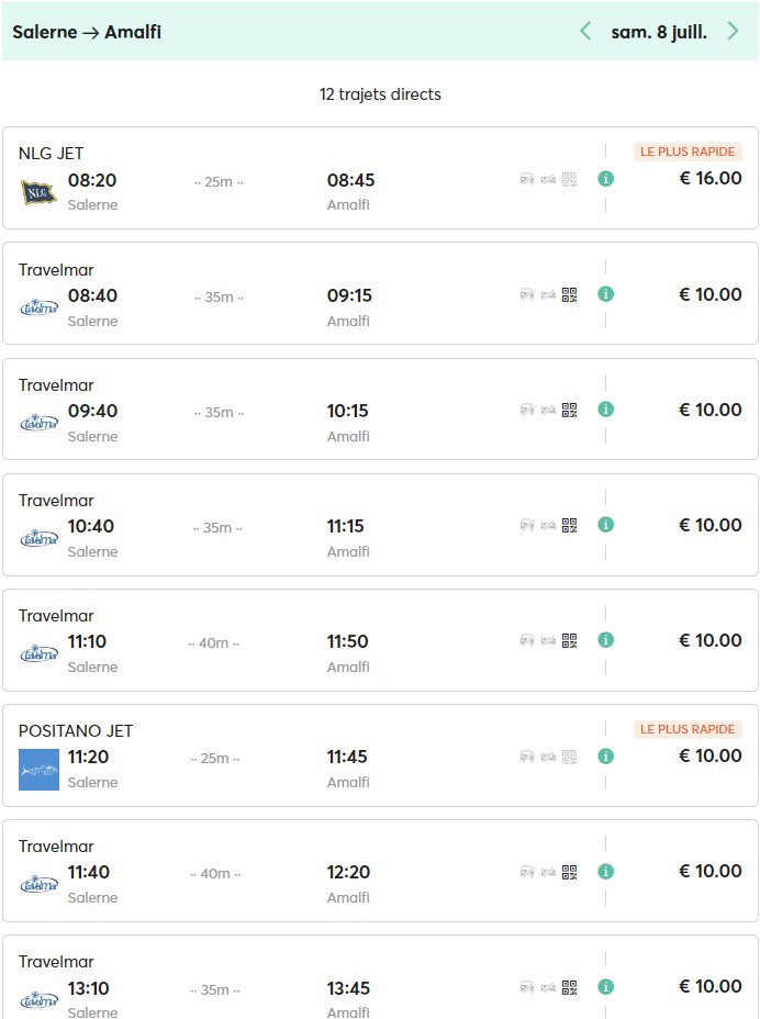 En général, le voyage est direct, sans escales intermédiaires. Toutefois, certaines compagnies proposent des traversées qui peuvent inclure des arrêts dans d’autres villes de la côte amalfitaine, ce qui peut prolonger le temps de voyage et augmenter ostensiblement le prix de votre billet.