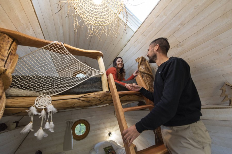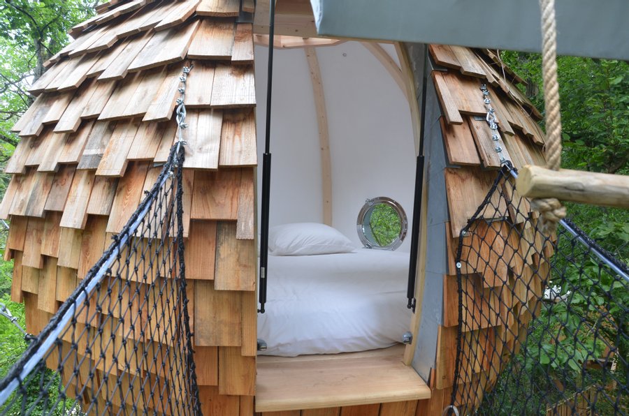 Nichée à 4 mètres de haut, c’est après avoir traversé le pont de singe que vous pourrez vous délecter du lit rond avec sa couverture chauffante, très appréciable en hiver.