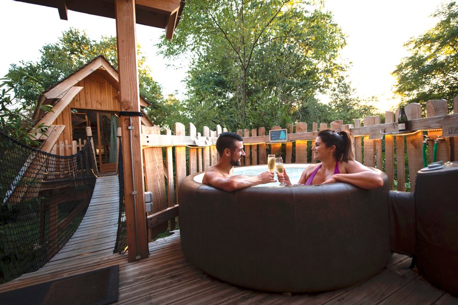 Prenez cinq mètres de hauteur, en grimpant dans les arbres. Sur la terrasse, vous trouverez votre jacuzzi privé. La salle de bain se trouve juste à côté. Pour accéder à la chambre, vous devrez traverser un pont de singe.