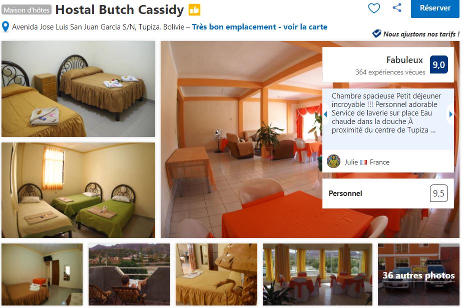 La veille de votre départ, vous aurez besoin de loger à Tupiza (les tours démarrent très tôt le matin). L’hôtel Butch Cassidy très bien situé, confortable et vraiment bon marché. Vous pouvez retrouver les avis et les prix sur Booking : hostal Butch Cassidy.