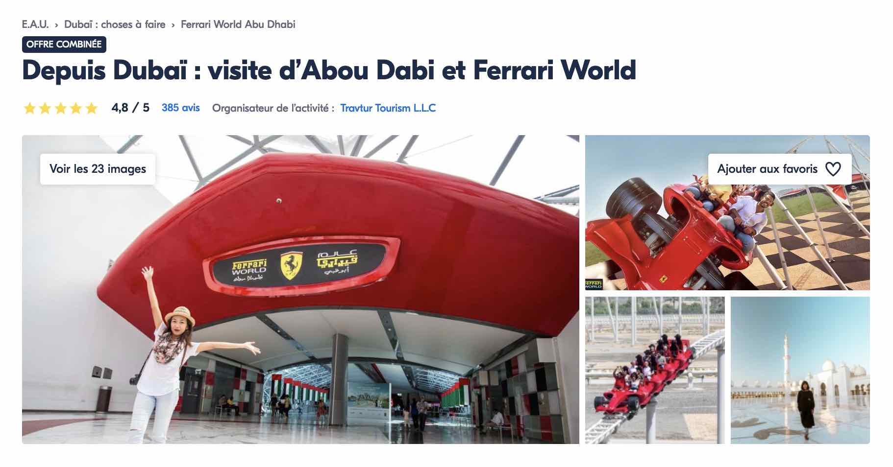 Cette excursion comprend le trajet aller-retour entre Dubaï et Abu Dhabi, la visite de l’Heritage Village, la visite de la mosquée Cheikh Zayed, l’entrée au parc à thème Ferrari World et le billet pour les montagnes russes Formula Rossa. Le tarif est à partir de 220 euros par personne.