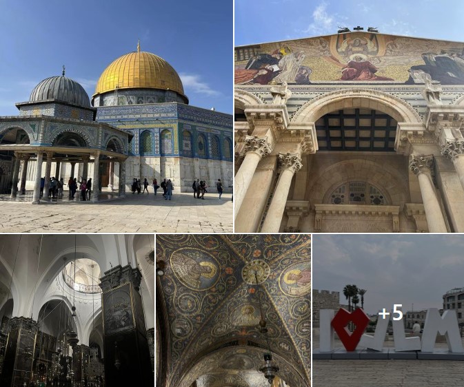 Le Dôme du Rocher et la Mosquée d’El Aqsa, lieux symboliques de l’Islam . La Via Dolorosa, ou Chemin de croix de Jésus jusqu’à l’église du St Sepulcre , lieu de sa crucifixion, de sa mort sur le Golgotha.