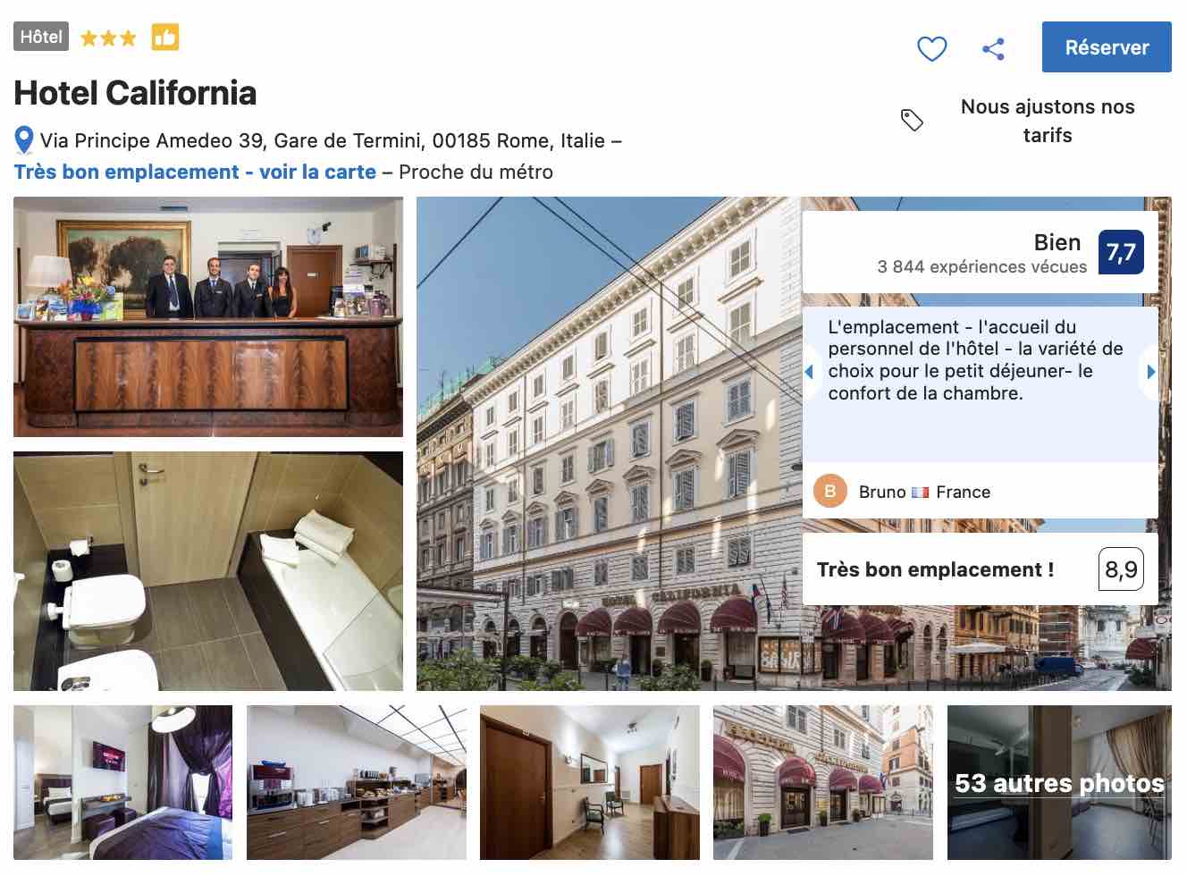 La première adresse que je vous recommande pour un logement pas cher est l’hôtel California situé à seulement 150 mètres de la gare de Termini. N’ayez pas peur, les chambres sont insonorisées, si bien que vous ne serez pas dérangés par le bruit extérieur ou l’arrivée des trains. Les prix des chambres tournent autour de la centaine d’euros pour un emplacement stratégique qui vous place à distance de marche ou de transports en commun de tous les sites de la cité romaine.