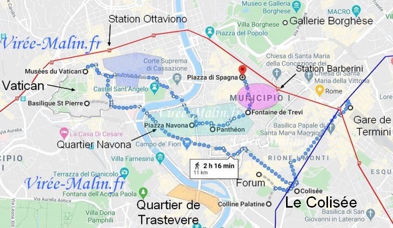 Pour commencer et que vous ayez une vue d’ensemble sur la position géographique des différents quartiers et sites incontournables de Rome, voilà une carte qui vous permettra d’avoir une vue d’ensemble. J’ai mis les deux lignes de métro (rouge et bleue) et comme vous pouvez le voir, l’intersection se trouve à la station Termini (qui se trouve à côté de la gare Termini, c’est ici que vous arriverez si vous prenez le Léonardo Express depuis l’aéroport Fiumicino).
