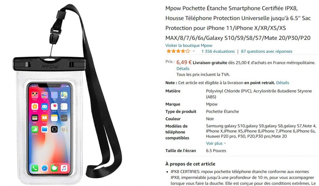 Fan de plongée, voyageur en bateau ou juste vous risquez de mouiller le téléphone durant une période de pluie, sachez que la solution est la pochette étanche pour téléphone. Elle permet de protéger votre précieux bijou des intempéries liées à l’eau. Avec un cordage, elle sera facile à saisir si jamais ça tombe dans l’eau.