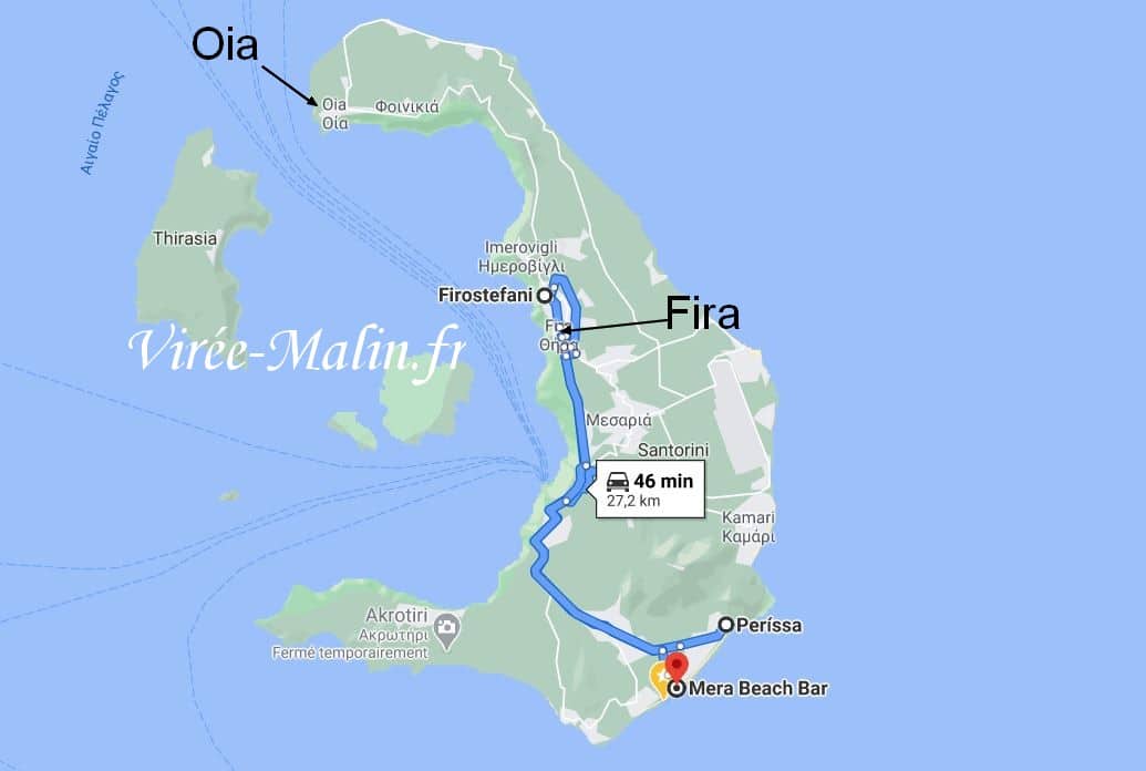 Comme vous pouvez le voir, depuis Firostefani ou Fira vous avez pas loin de 30 minutes pour rejoindre l’agence, 40 minutes (voir 50 minutes) depuis Oia.