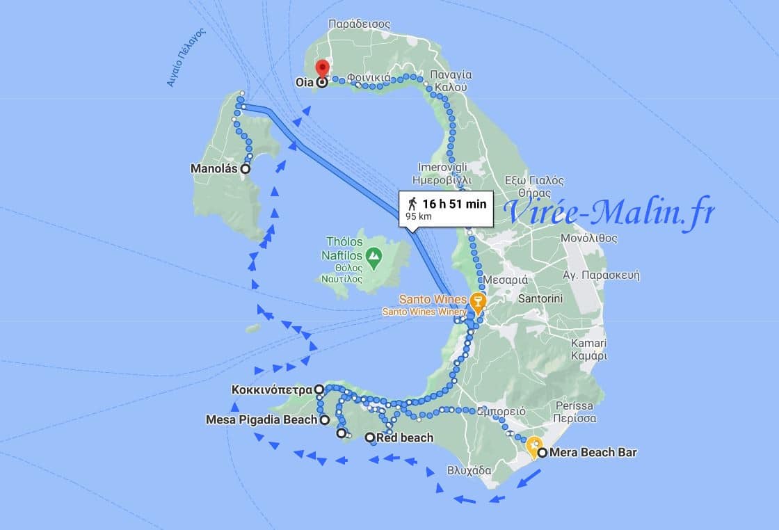 Là vous faites entre 200 et 260 minutes, cela dépend toujours de votre rapidité… Là vous allez jusqu’à Oia, donc cela fait un sacré tour ! Perivolos – Vlychada – Red Beach – Mesa Pigadia – White Beach – Black Mountain – Volcano – Caldera – Thirasia – Oia