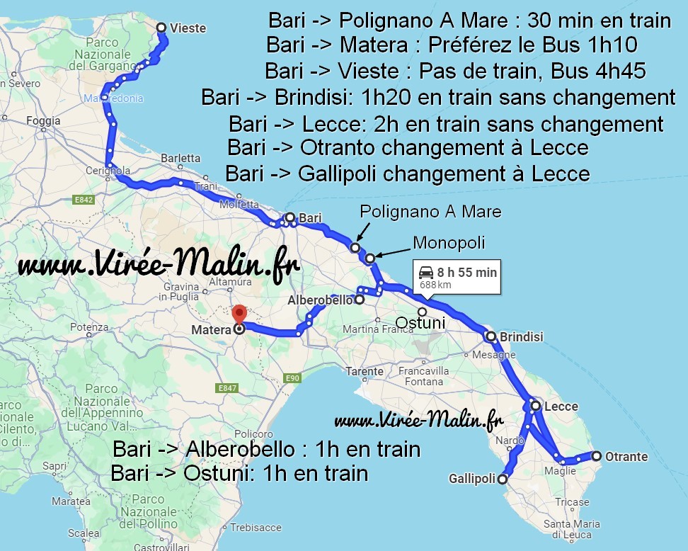 Comme dans mon habitude voilà une carte que j’ai personnalisé et qui vous permet de voir les villes incontournables à visiter dans les Pouilles et les durées en temps si vous utilisez le train depuis Bari (la ville où vous allez arriver en avion).