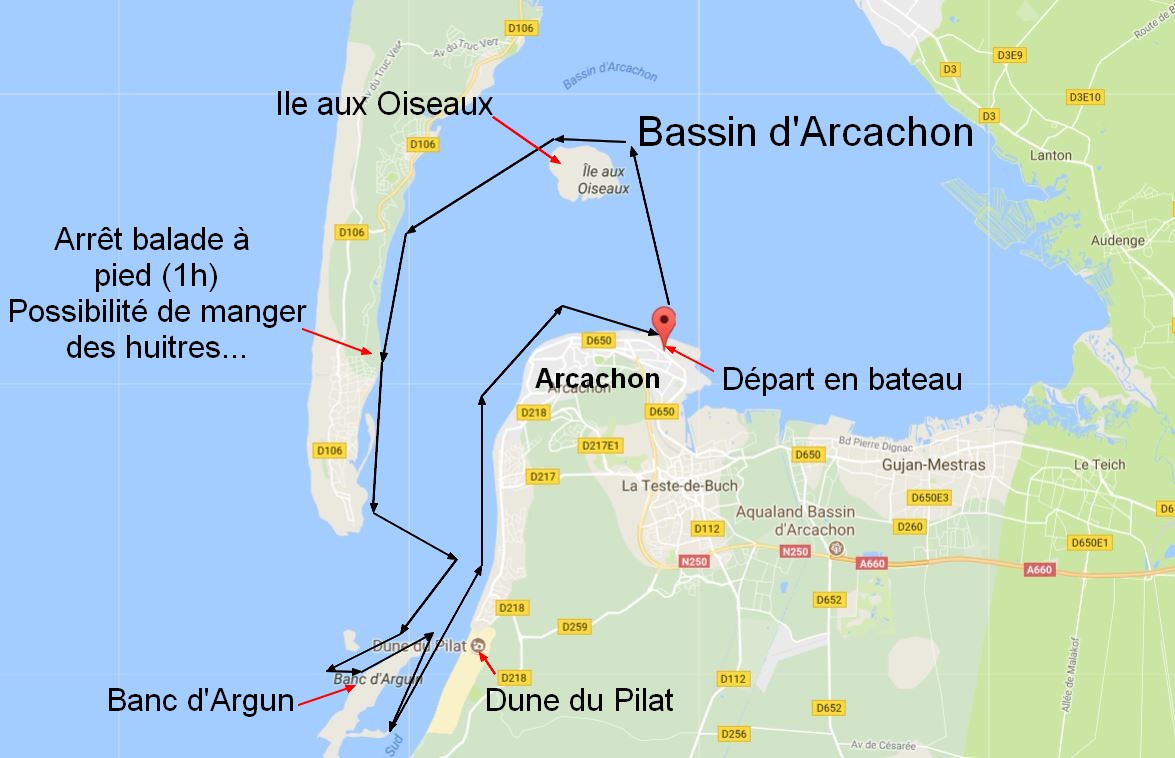 - Cliquez ici pour agrandir cette GoogleMap – Visite du bassin d’Arcachon en bateau: