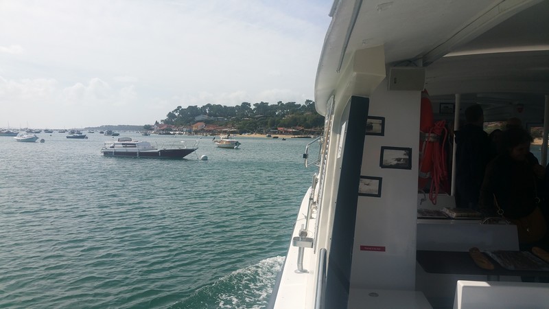 Nous voulions opter pour le bateau traditionnel du bassin d’Arcachon, la pinasse, mais le beau temps n’était au final pas certain, alors Olivier nous a plutôt conseillés de prendre la vedette couverte dont le toit est en partie escamotable.