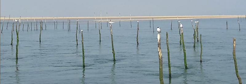 Pendant ce temps là , nous longeons le Mimbeau qui est une jolie petite baie et il y a pas mal d’oiseaux sur les piquets alors Olivier nous les montre aux jumelles et nous explique comment identifier les principaux oiseaux et aussi l’histoire de la migration des oiseaux sur le bassin d’Arcachon