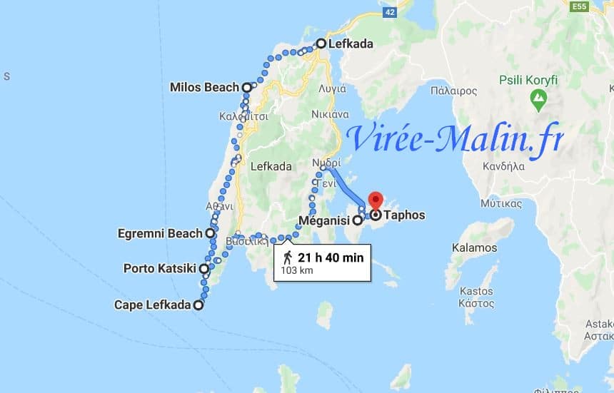 - Cliquez ici pour agrandir cette GoogleMap – Itinéraire en bateau sur l’île de Lefakda :