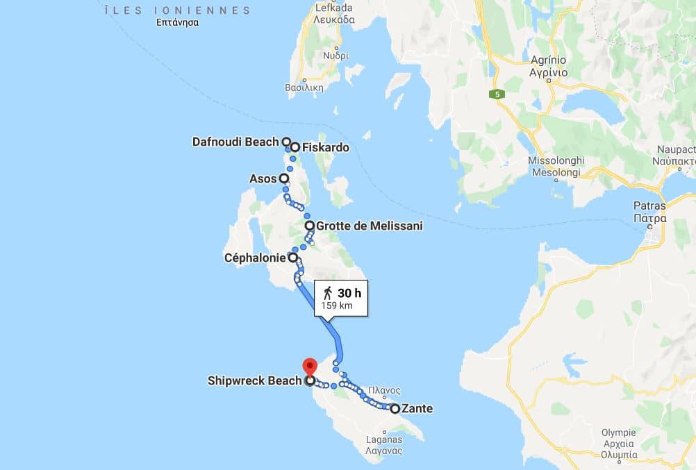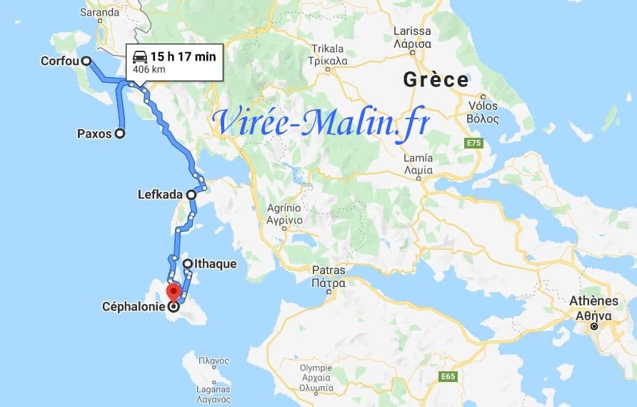 - Cliquez ici pour agrandir cette GoogleMap – Itinéraire sur l’île de Cephalonie en bateau :