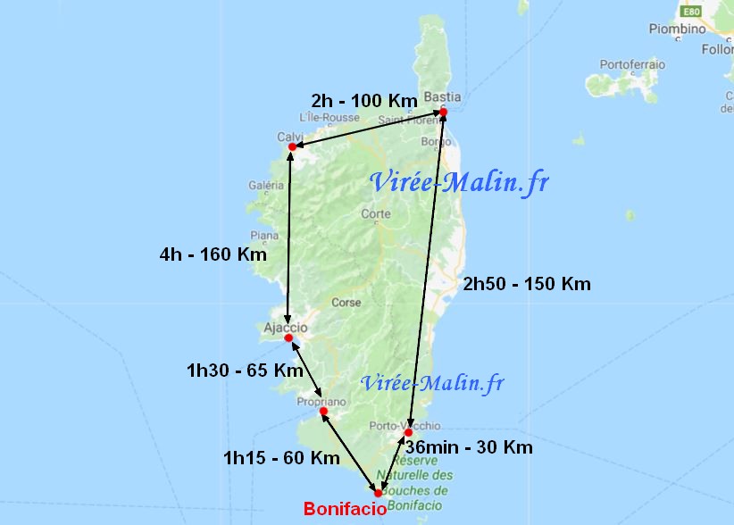 Voilà un plan avec les distances en voiture en Corse. Comme vous pouvez le voir, ça prend du temps pour rejoindre un point à un autre.