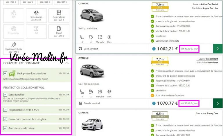 Et bien c’est l’offre et la demande, donc pendant les beaux jours, c’est à dire juillet et août le prix d’une voiture de location (avec la Pack protection premium que je vous conseille) commence à partir de 33€/jour, ce que je trouve, reste raisonnable. Et pour les mois de février… les prix peuvent descendre à 12 euros/jour.