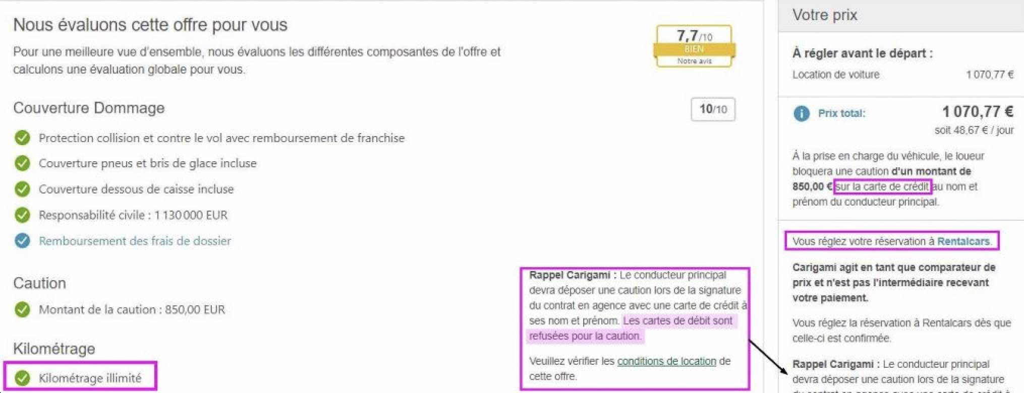 - Disposer d’une carte de crédit (et non de débit attention à ça, c’est écrit sur votre cb) permettant de prélever les franchises et cautions ou les éventuelles contraventions pendant la durée de la location.
