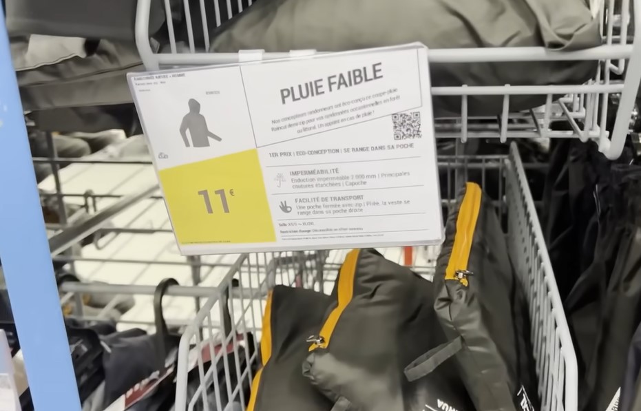 - Et une petite veste de pluie, c’est à dire un K-Way, vous avez par exemple celle là qui coûte 11€ et qui pèse 180gramme. Utile s’il pleut lors de votre bivouac…
