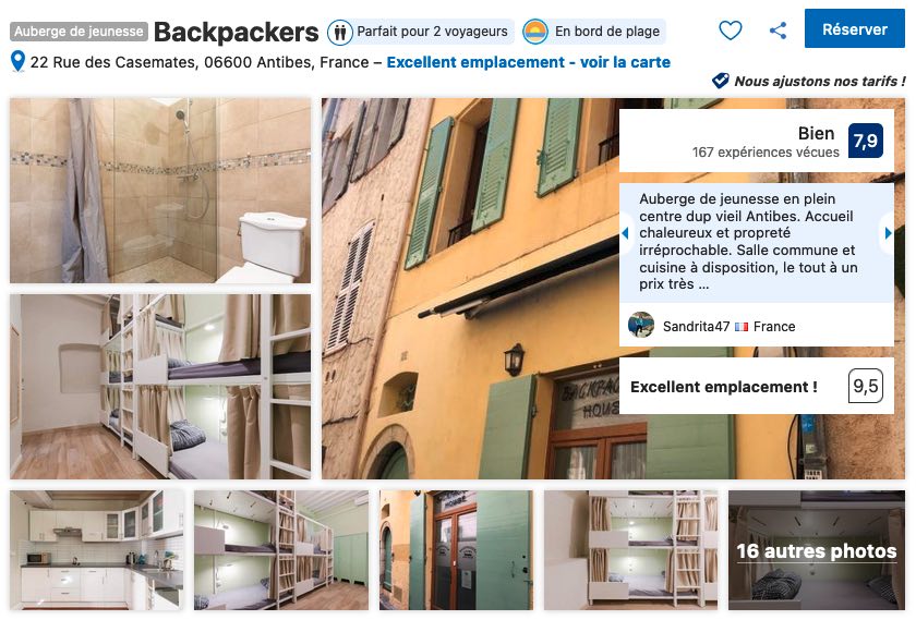 Ce logement “Backpackers” n’est pas vraiment un hôtel, mais si vous cherchez un logement vraiment pas cher à Antibes, je vous conseille cette auberge de jeunesse en plein cœur du vieil Antibes. Cet établissement est très bien situé sur le front de mer d’Antibes, à quelques mètres du musée Picasso et à quelques pas des plages.