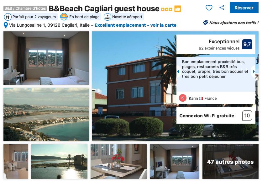 Si vous voulez profitez d’un tel emplacement privilégié et vous permettre de rejoindre plage et lieux festifs à pied, je vous recommande sans hésitation le B&Beach Cagliari Guest House qui, en plus d’être très bien situé et de proposer des chambres très confortables et modernes, reste très accessible avec des chambres à partir de 70 euros selon la période de votre séjour à Cagliari avec les petits déjeuners compris.
