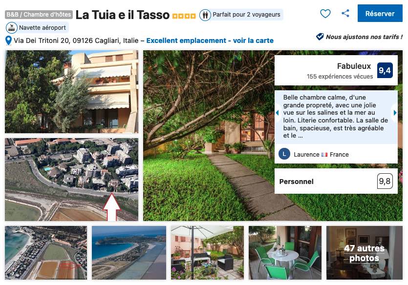 Les autres établissements situés tout le long de la plage de Poetto étant relativement chers pour des standings bien plus élevés, si vous voulez trouver où loger à Cagliari, dans le même secteur tout en restant dans un budget raisonnable, vous pouvez jetez un œil à la Tuia e il Tasso, qui, pour moins de 80 euros pour deux personnes avec les petits déjeuners, se situe à une dizaine de minutes à pied de la plage et des boîtes de nuit emblématiques du front de mer.