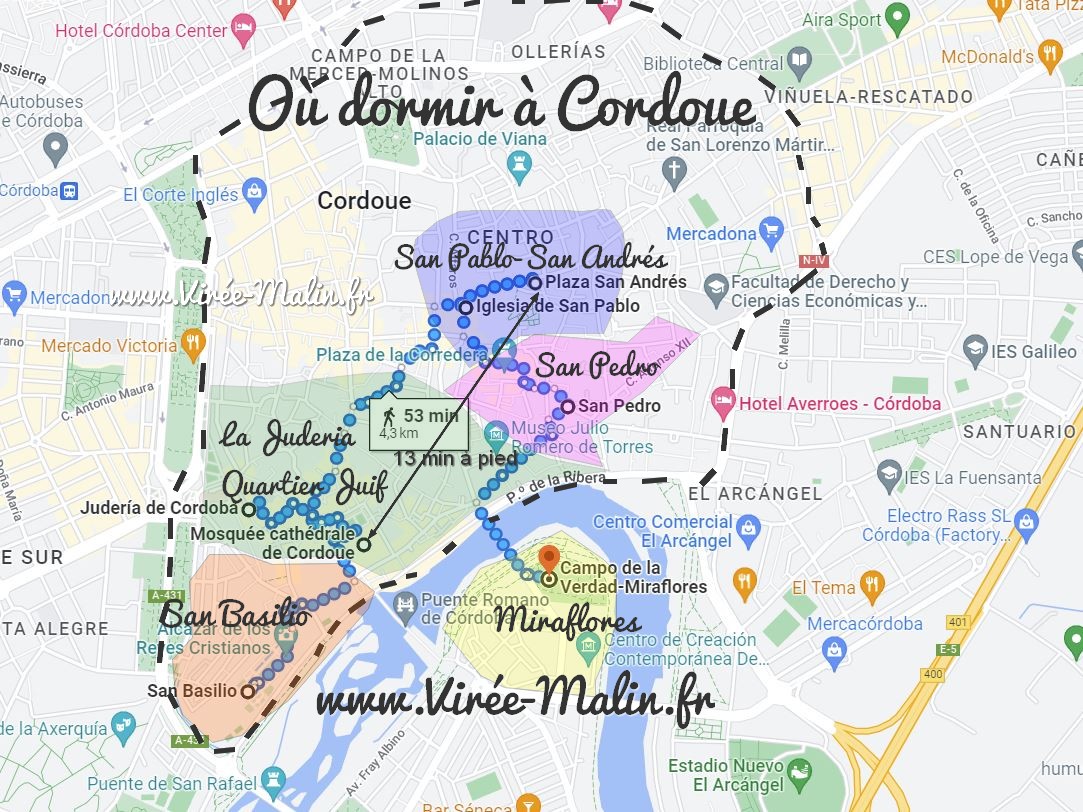 Comme vous pouvez le voir sur la carte que j’ai personnalisé ci-dessous, pour rejoindre la célèbre Mezquita (Mosquée Cathédrale de Cordoue) depuis la Plaza San Andrés (donc le quartier San Pablo) il n’y a même pas 15 minutes de marche donc si vous trouvez un logement dans cette zone vous serez idéalement placé pour visiter Cordou et sortir le soir. Comme je viens de vous le dire, le centre ville de Cordoue se trouve à l’intérieur des pointillés mais pour être encore plus précis optez pour un logement dans les quartiers que j’ai mis en surbrillance, je ne peux pas faire plus clair :)