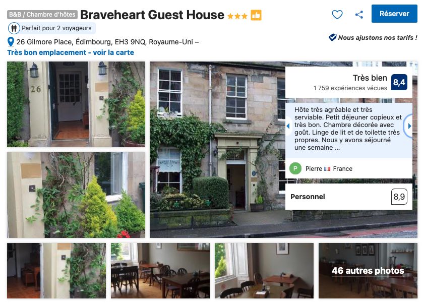 C’est ainsi que vous pouvez choisir de dormir au Braveheart Guest House situé dans le quartier de Fountain Bridge au sud du centre-ville mais à seulement 20 minutes de marche de Princes Street et du Château d’Edimbourg. Les tarifs y sont très raisonnables et les petits déjeuners à 7 euros seulement.