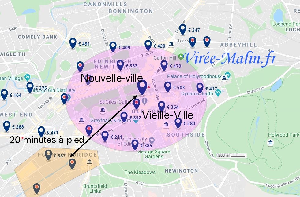 Pour ceux qui me font déjà confiance, le centre ville d’Edimbourg se trouve dans la zone violette, c’est donc ici que je vous conseille de trouver un logement à Edimbourg. Si vous ne trouvez pas votre bonheur et que vous cherchez un hôtel pas cher à Edimbourg car les prix peuvent s’envoler c’est dans la zone orange que je vous conseille de jeter un œil.