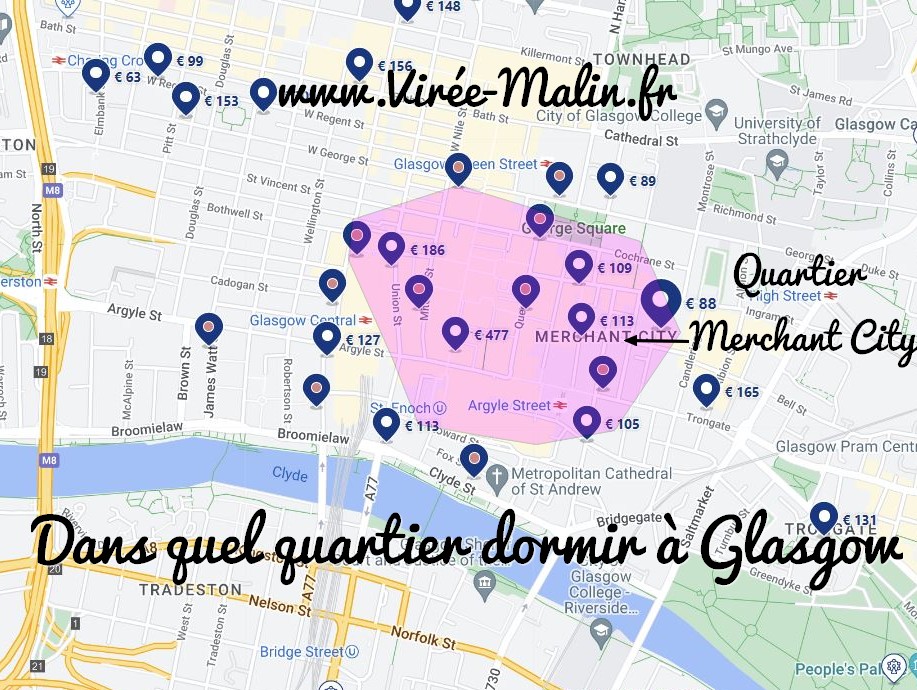 Si vous partez pour un court séjour, je vous recommande de loger dans le quartier de Merchant City situé dans l’hypercentre du centre de Glasgow. Ce quartier se situe à proximité de nombreux lieux touristiques comme la Galerie d’art moderne de Glasgow (GOMA) ou encore la place Georges square, place incontournable de la ville avec ses personnages historiques. C’est un des quartiers les plus huppés de la ville, par conséquent les prix des hébergements sont assez élevés.