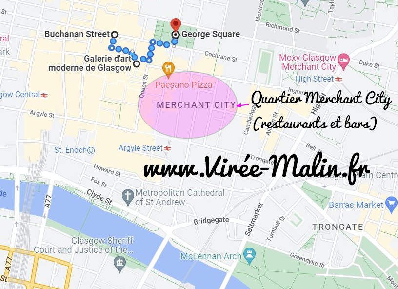 Le mieux c’est de loger proche du quartier Merchant City, cliquez ici pour agrandir cette HôtelMap :