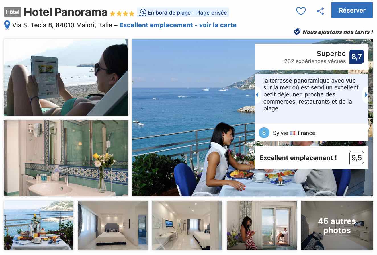 Enfin, si vous voulez vous faire plaisir lors de votre séjour à Maiori, je vous recommande l’hôtel Panorama. Cet établissement porte bien son nom puisqu’il se situe en léger surplomb de la mer. Sur place, vous trouverez une piscine, un bar avec terrasse ainsi qu’une plage privée à moins d’une vingtaine de mètres de l’établissement.