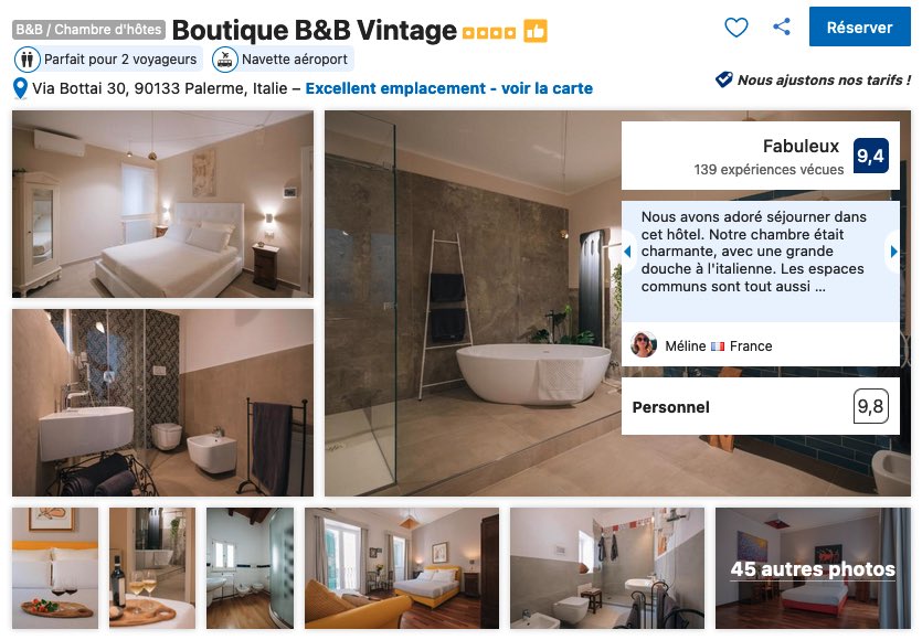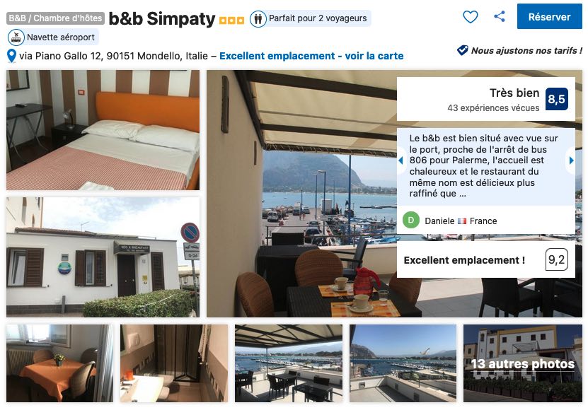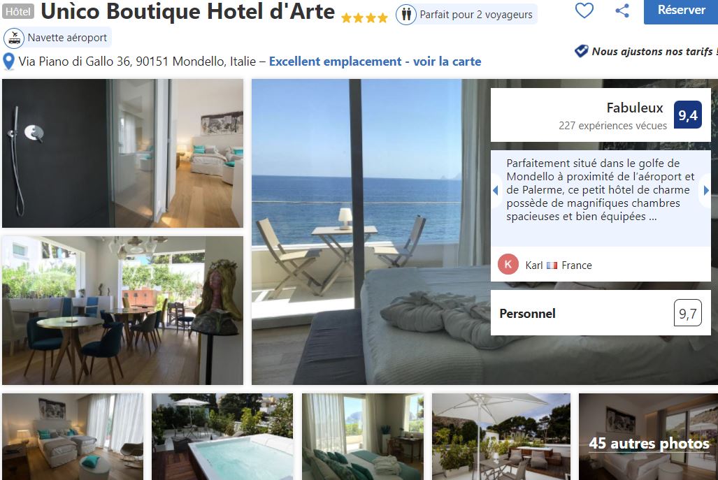 Un petit dernier, si vous préférez les prestations hôtelières qui sont forcément plus professionnels et que vous voulez vous faire vraiment plaisir, jetez un œil à l’hôtel Unico Boutique, il se trouve sur la baie de Mondello (au Nord de la plage). Vous serez plus au calme tout en ayant la plage au pied de l’hôtel ! Le prix va avec mais ils proposent parfois des discounts…