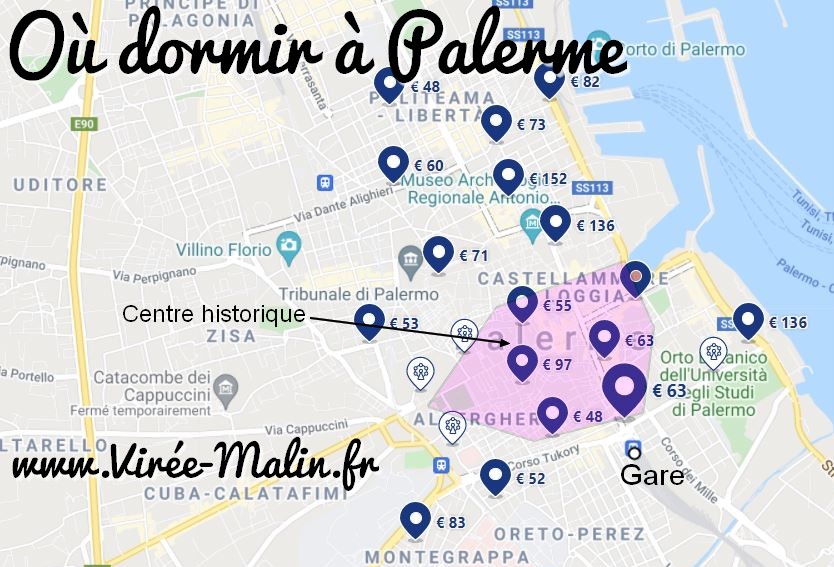 Pour ceux qui me font déjà confiance c’est dans la zone violette que je vous conseille de loger à Palerme, vous serez idéalement situé car vous êtes dans le coeur historique de Palerme et donc à deux pas des restaurants et bars. Jetez un œil à la maison d’hôte Liberty Palace c’est un très très bon rapport qualité/prix et idéalement placé!