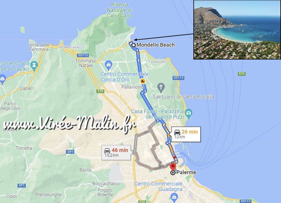 Comme vous pouvez le voir sur la GoogleMap ci-dessus il faut 25 minutes en voiture pour rejoindre la plage de Mondello…
