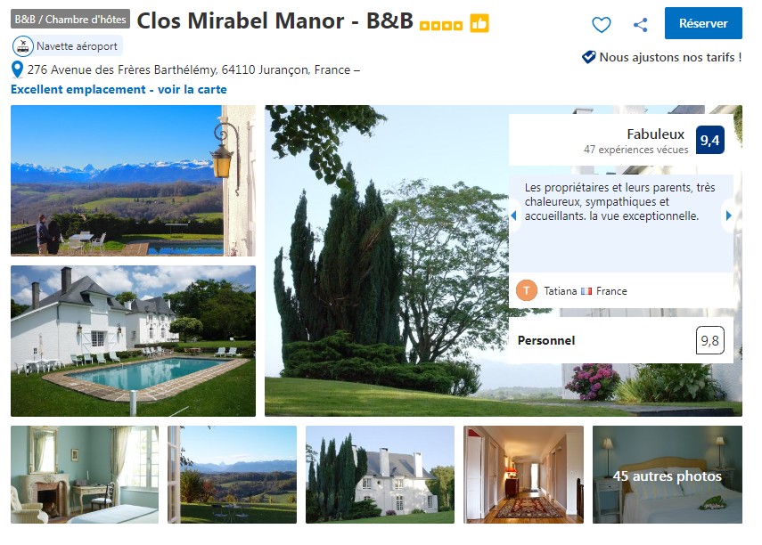 Cet établissement se situe à environ 10 minutes de Pau. Je vous l’ai sélectionné notamment pour son jardin, et pour sa vue sur les Pyrénées.