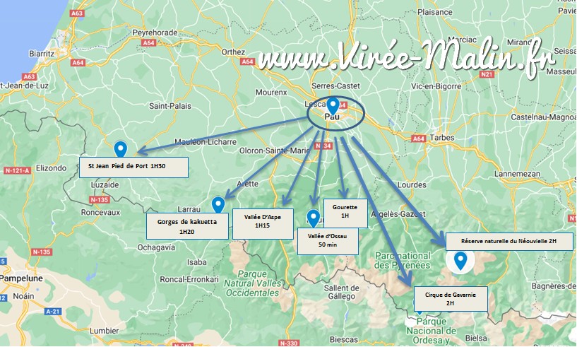 Pour ma part, j’aime faire une escale à Pau avant de me lancer dans une expédition nature. Comme vous pouvez le voir vous êtes à 1h de voiture de Pau de nombreuses destinations en plein air: