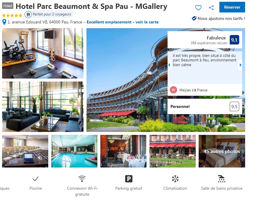 Je vous conseille également l’Hôtel Parc Beaumont & SPA, Je l’apprécie surtout pour la piscine à disposition, la salle de sport, et la possibilité de choisir le type de vue (Jardin ou montagne). Par ailleurs, le restaurant de l’hôtel est très bon et a très bonne réputation à PAU.