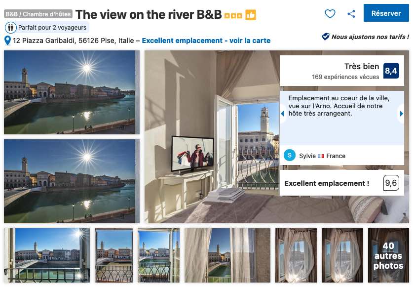 Un peu plus classe, et donc un peu plus cher, mais toujours avec la possibilité de louer une chambre avec vue sur la rivière et les quais de Pise, vous avez aussi l’hôtel The View on The River qui porte bien son nom devant le panorama depuis les balcons de ses chambres.