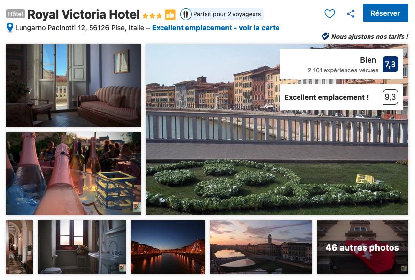Cette fois ci, une bonne adresse avec un bon rapport qualité/prix, situé dans le quartier Santa Maria et en plus sur les rives de la rivière Arno qui traverse la ville, c’est au Royal Victoria que je vous invite à loger à Pise. Un des rares établissements dans ce quartier historique de Santa Maria à vous proposer un emplacement au bord de l’eau.