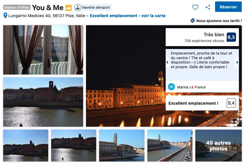 Toujours en bordure de l’Arno, dans la même catégorie de prix et pour des prestations similaires, et si vous ne trouvez plus de disponibilités au Royal Victoria, vous trouvez à quelques centaines de mètres plus en avant de la rivière, mais toujours sur les quais, le You & Me, une maison d’hôtes ravissante qui vous place à seulement 15 minutes de marche de la Tour de Pise et des principaux sites historiques de la ville.