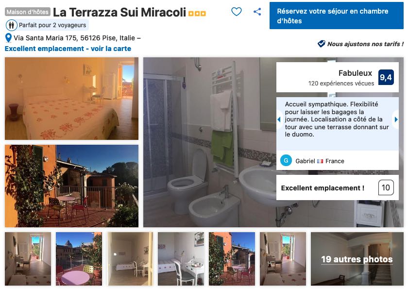Un peu plus au nord encore, cette fois c’est dans une maison d’hôtes dont je n’ai pas fait l’expérience, mais qui semble trouver les louanges de nombreux visiteurs. La Terrazza Sui Miracoli vous propose la location d’une chambre tout confort avec une terrasse lumineuse vous donnant une vision des toits de Pise à seulement une centaine de mètres de la Tour de Pise.