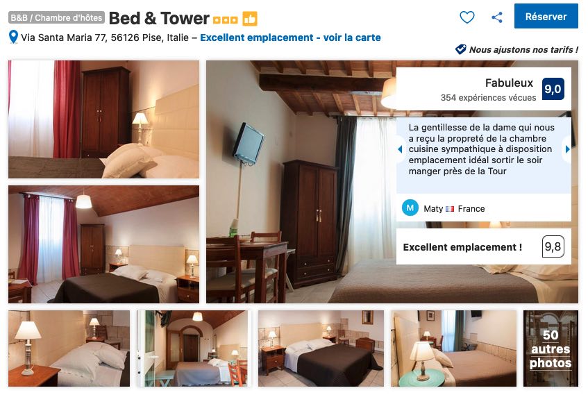La première adresse que je vous conseille et qui semble faire l’unanimité auprès des voyageurs pour son emplacement, ses prestations et ses tarifs, est une maison d’hôtes : le Bed &Tower qui, comme son nom le suggère se trouve à proximité de la Tour de Pise, mais aussi de la plus ancienne rue de la ville, la Via Santa Maria qui vous mène de l’établissement jusqu’au Jardin botanique de Pise.