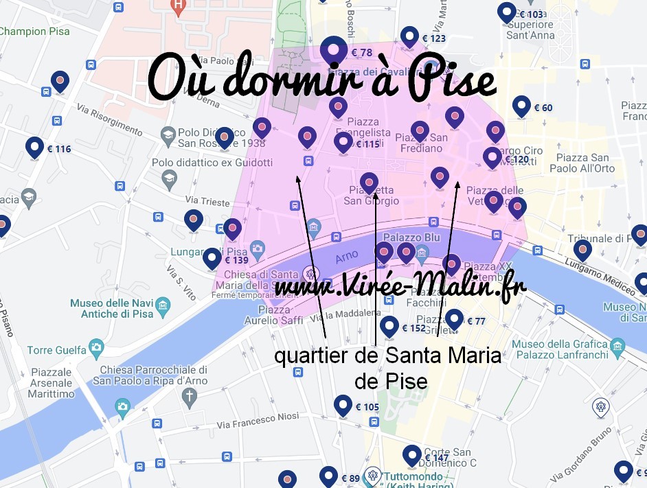 Vous voulez savoir où dormir à Pise pour pouvoir visiter la ville à pied facilement ? Dans quel quartier loger dans la ville de Pise pour pouvoir sortir le soir sans prendre les transports ? Comment rejoindre Pise depuis Florence ou La Spezia (porte d’entrée des Cinque Terre).