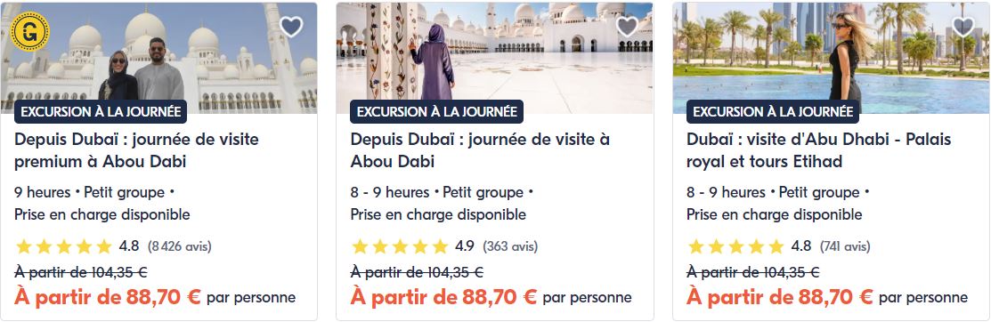 Pour ceux qui me font déjà confiance, je conseille de passer deux nuits grand maximum à Abu Dhabi donc au minimum 1 nuit à Abou Dabi mais avec 1 journée de libre, cela sera suffisant pour visiter la Mosquée Cheikh Zayed, de visiter le Louvre d’Abu Dhabi (pensez au billet coupe file), la Corniche, le Palais Présidentiel (Qasr Al Watanà). A savoir qu’il est impossible de visiter la ville à pied, les sites incontournables sont trop excentrée l’une de l’autre. Si vous séjournez à Dubaï il y a des excursions à la journée sur le site GetYourGuide.