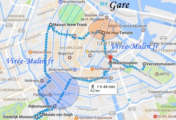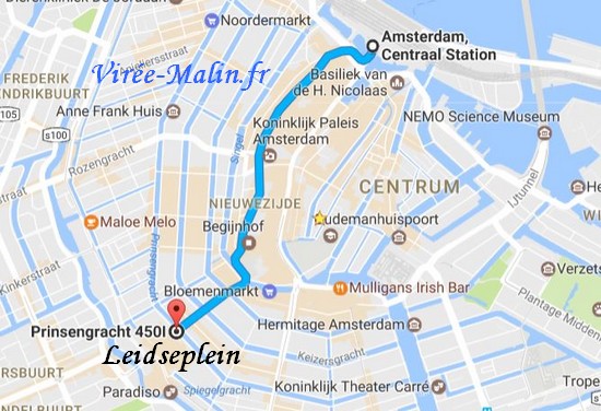 Avant de commencer, voilà une carte GoogleMap avec les principaux sites à visiter à Amsterdam qui vous permet d’avoir un aperçu sur la topographie. A savoir que c’est à la Gare d’Amsterdam que vous allez sans doute arriver car il y a une ligne de train qui va directement à l’aéroport Schipol d’Amsterdam. A savoir aussi qu’il y a des trams qui sillonnent de manière efficace la ville. Encore une fois c’est dans le quartier Leidesplein que je vous conseille de loger, un quartier très vivant.