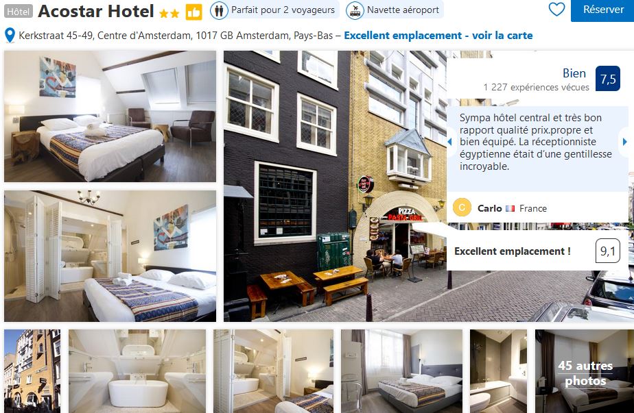 Je vous conseille l’Acostar Hôtel, un petit hôtel idéalement placé à Leidseplein, très propre avec un bon rapport qualité/prix. Lisez les avis !