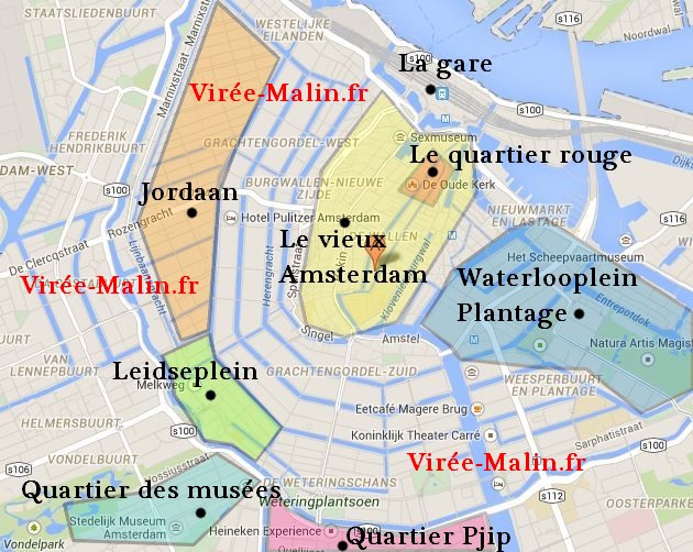Si vous trouvez un logement entre la zone verte et le quartier bleue (qui représente le quartier Jodenbuurt) vous serez bien placé, vous êtes dans le cœur des canaux pittoresques d’Amsterdam, c’est vraiment adorable et vous êtes à deux pas du centre centre. Vous verrez que quoiqu’il en soit, ces zones représentent le cœur d’Amsterdam!
