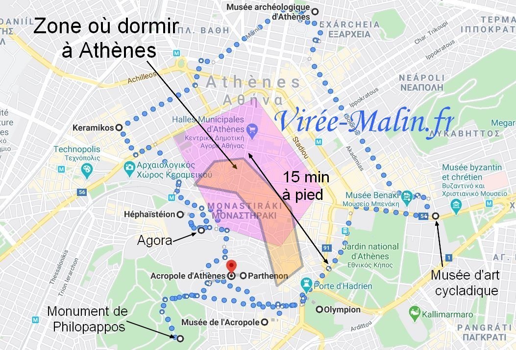 Pour faire simple, je vous conseille de loger dans la partie violette de la carte ci-dessous. Dans cette zone vous serez très bien placé. Pour ma part j’ai logé à l’hôtel Athenes21 qui se trouve rue Athinas. Une adresse très bien placé puisque vous êtes à 30 secondes de la place Monastiraki, qui est le centre centre d’Athènes.